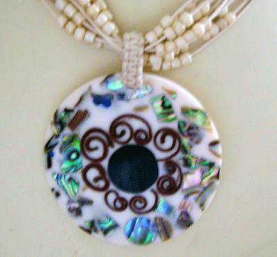 paua shell mosaic with round black mop shell inside necklace with bead